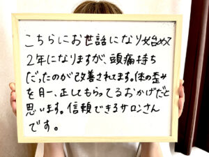 ネイリストのK様も、右肩の痛みで来店されました。細かい作業を長時間続けるため、肩から首にかけての緊張が強く、頭痛も併発していました。